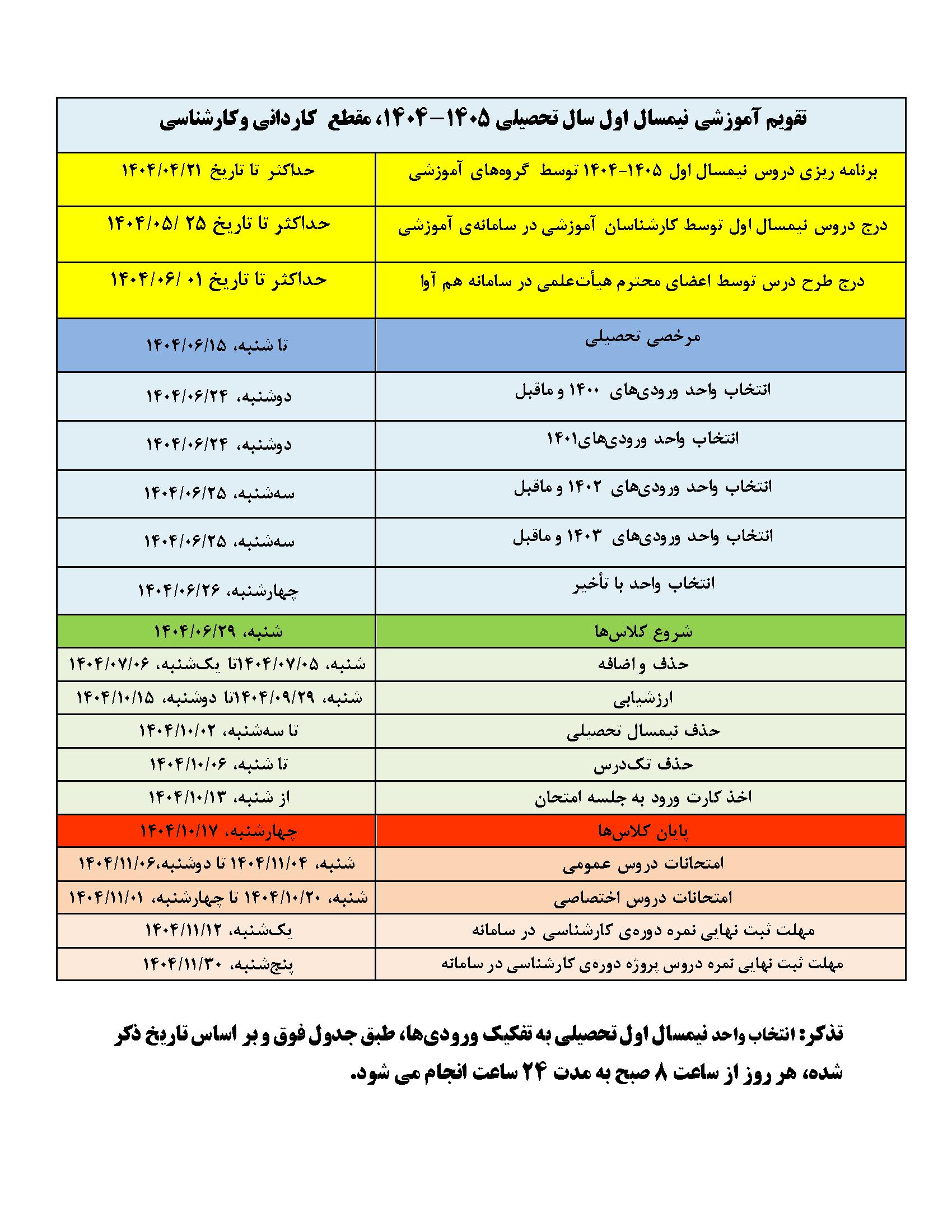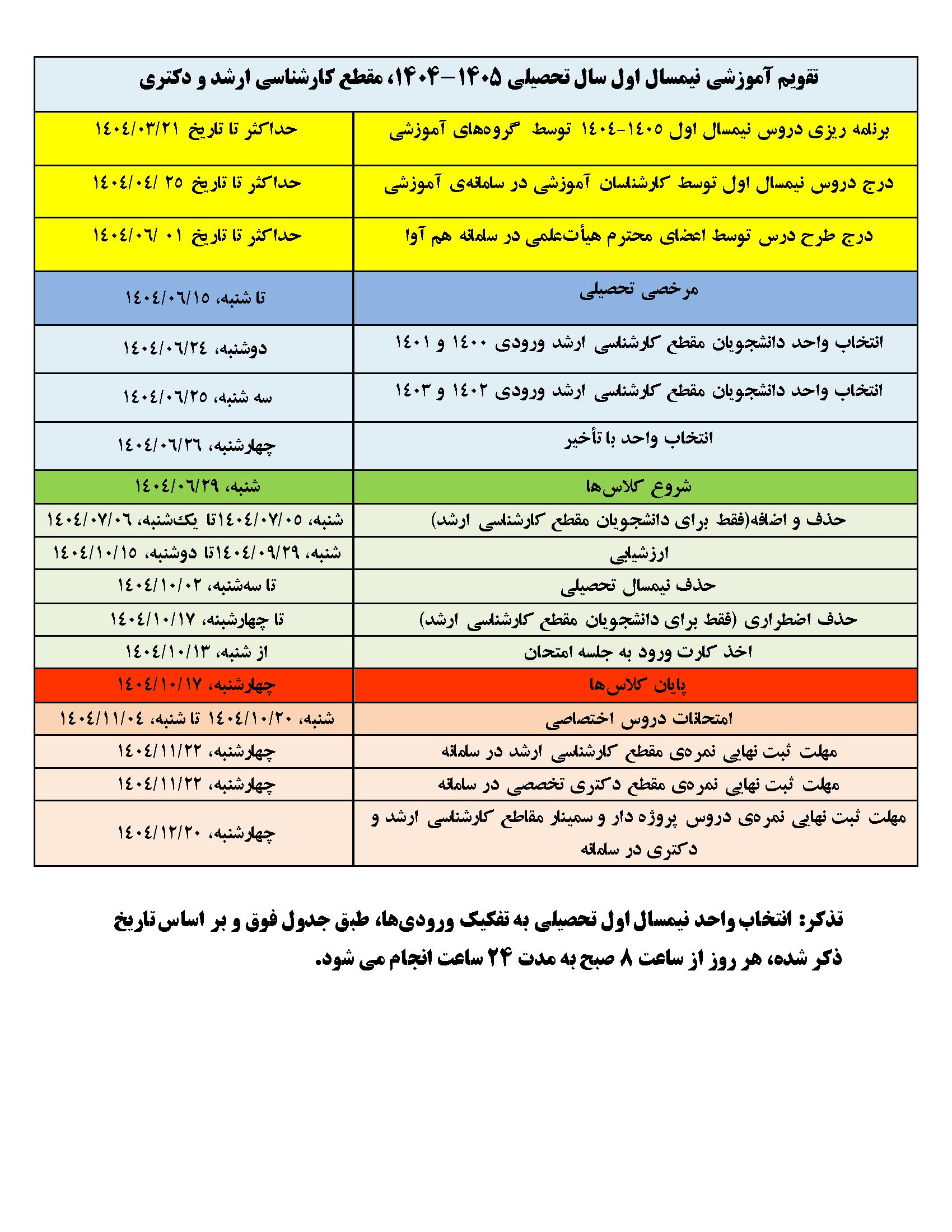 تقویم آموزشی نیمسال اول سال تحصیلی 1405-1404، در مقاطع کاردانی، کارشناسی، کارشناسی ارشد و دکتری به شرح ذیل است.